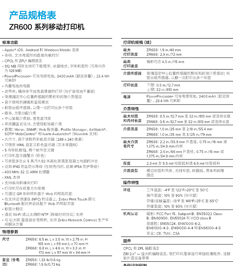 ZEBRA 斑马蓝牙便携打印机 无线条码标签打印机 ZR668 蓝牙WIFI版 (72mm宽)